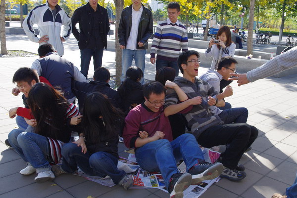 观赏完了中国这伟大的建筑,我们开始在广场上进行素质拓展,也就是通过一些团队合作的活动增进相互之间的了解,加深彼此之间的感情。首先进行的是一个简单的游戏---“滚雪球”,大家依次介绍自己的姓名和专业,由下一位同学重复前面同学的信息并自我介绍,一轮“热身”下来,大家开始慢慢熟悉起来。接下来抽签分组,24人分为4组,又进行了“五毛一块”、“传气球”、“三人夹球跑”、“过电网”、“表演传词”、“纸杯传水”、“瞎子背瘸子”等活动,这些游戏少不了同学们的相互配合和齐心协力。游戏的过程中各种状况层出不穷,真可谓“只有想不到,没有做不到”。虽然有的组同学失败多次,但是仍然坚持完成任务,一阵阵的欢声笑语引来周围游客的围观,有些人在这欢乐气场的笼罩下和我们一起做起了游戏。最后的胜利者得到了精美的奖品,得到奖品的同学更是开心地相互展示自己的成果,让人羡慕的得瑟了一把。把活动推向高潮的是“坐地起身”,这个活动要求大家围成一圈,背对背的坐在地上,大家手 "桥" 手,然后一同站起来。大家想着各种办法互相配合帮助,最开始的时候配合不那么默契,摔倒几个那叫家常便饭,在经历几次失败之后,大家就能很协调地互助站立,只是可怜了铺在地上的报纸,已经被我们蹂躏的面目全非了。